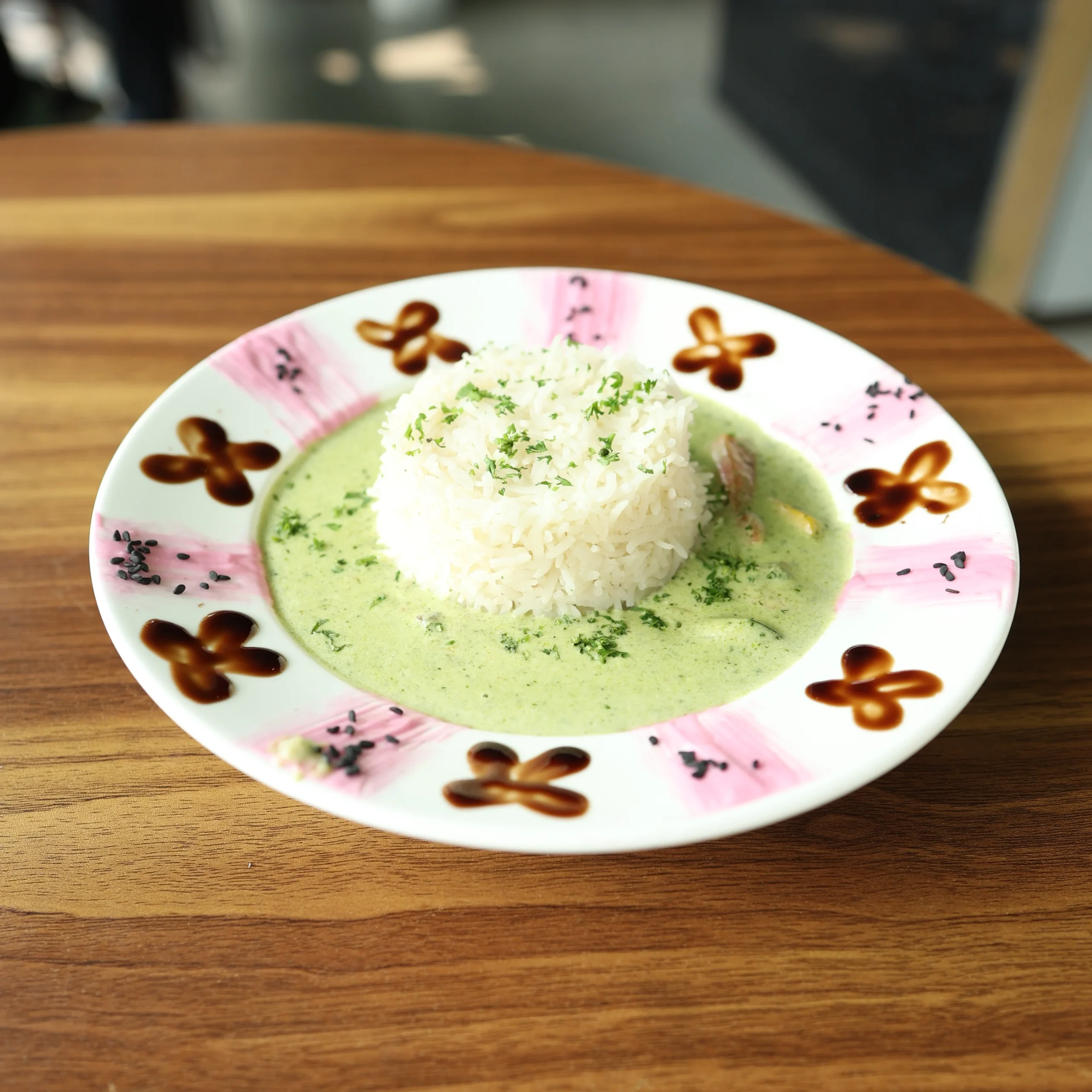 Avayacafe’s Pesto Rice Bowl consists of fluffy rice blended with creamy handmade pesto and topped with grilled chicken or fresh vegetables. A colorful, healthy dish full of flavors inspired by Italy—ideal for a high-end café lunch or dinner.